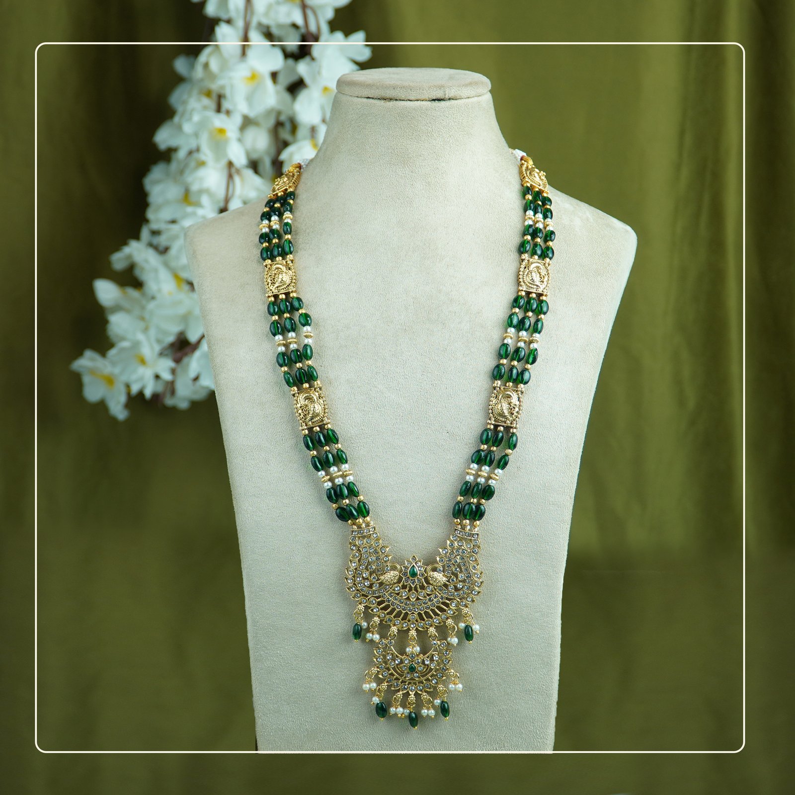 Mayurika Long Set | Peacock Design Kemp Stone Necklace with Beaded Mala