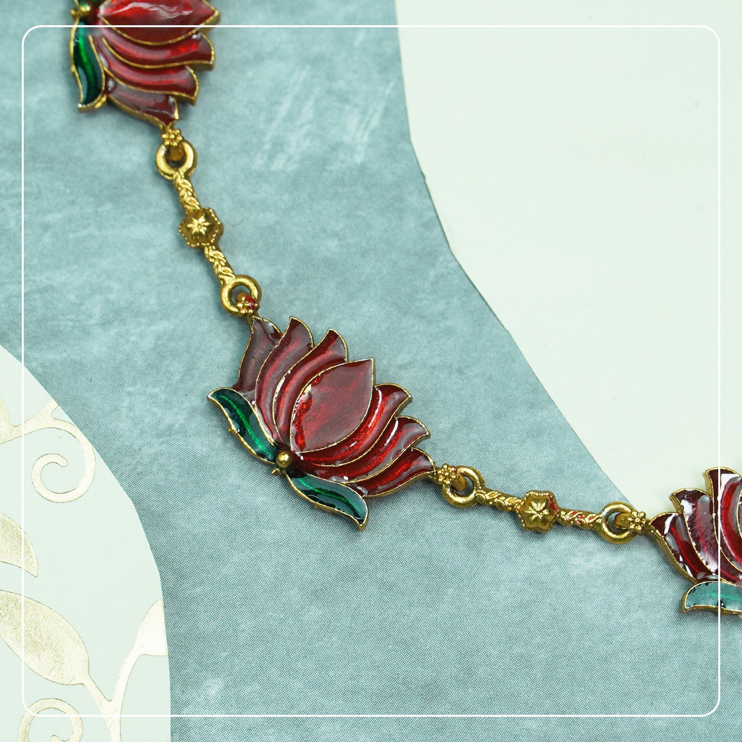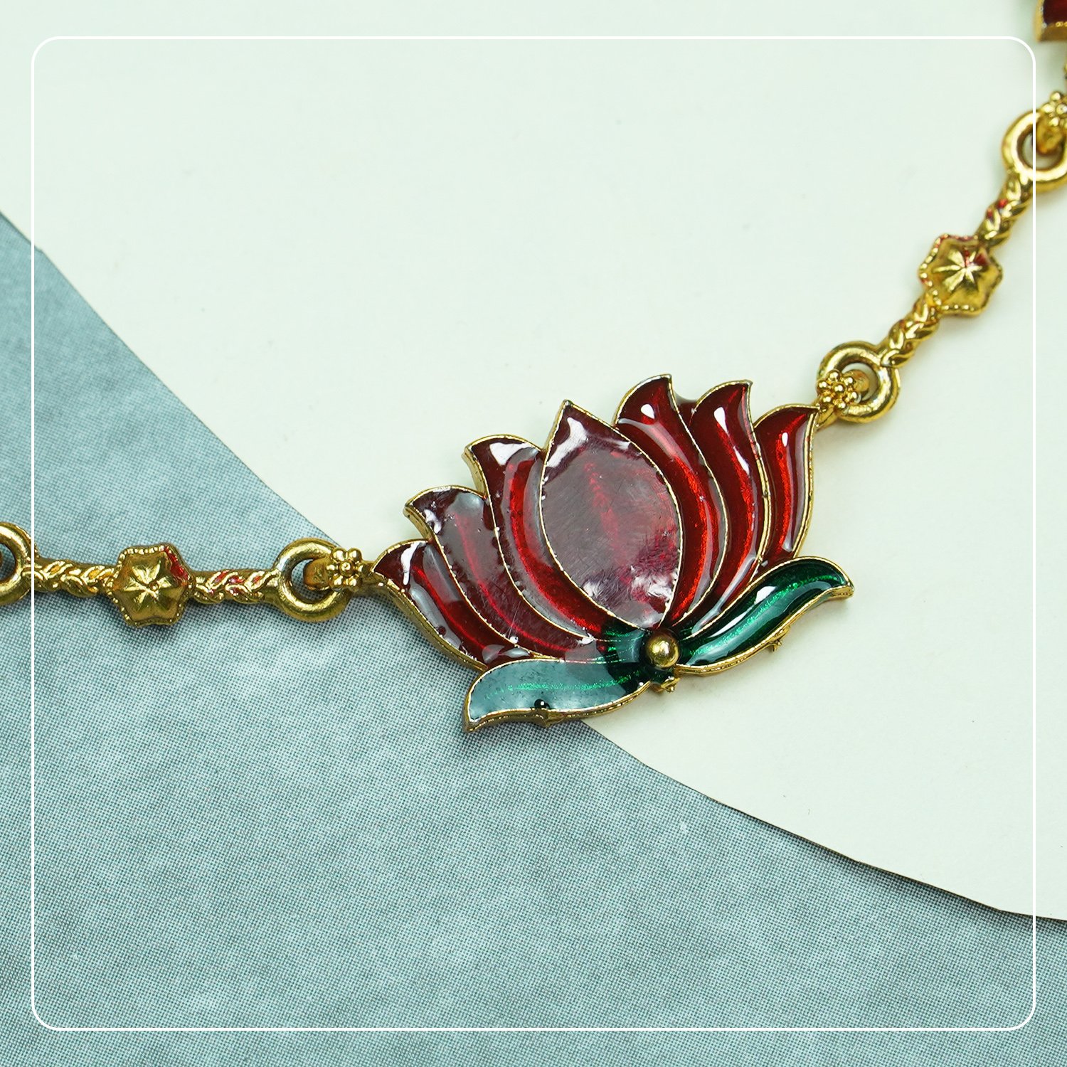 The Trendy Lotus Necklace by Pinak Jewel is your go-to accessory for everyday ethnic style. Available in multicolour, red, and green, this lightweight piece pairs beautifully with kurtis, sarees, and fusion wear.