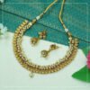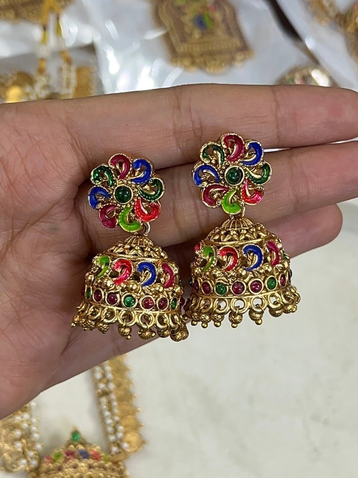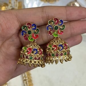 Completing the set is a pair of meenakari jhumka earrings with a multi-petal floral stud and cascading bell-shaped jhumka, perfectly matching the necklace in every detail.