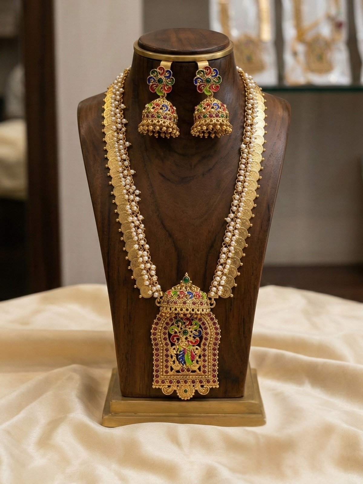 ✦ Set Includes Long Radha Krishna Temple Necklace + 1 Pair Meenakari Jhumka Earrings