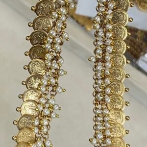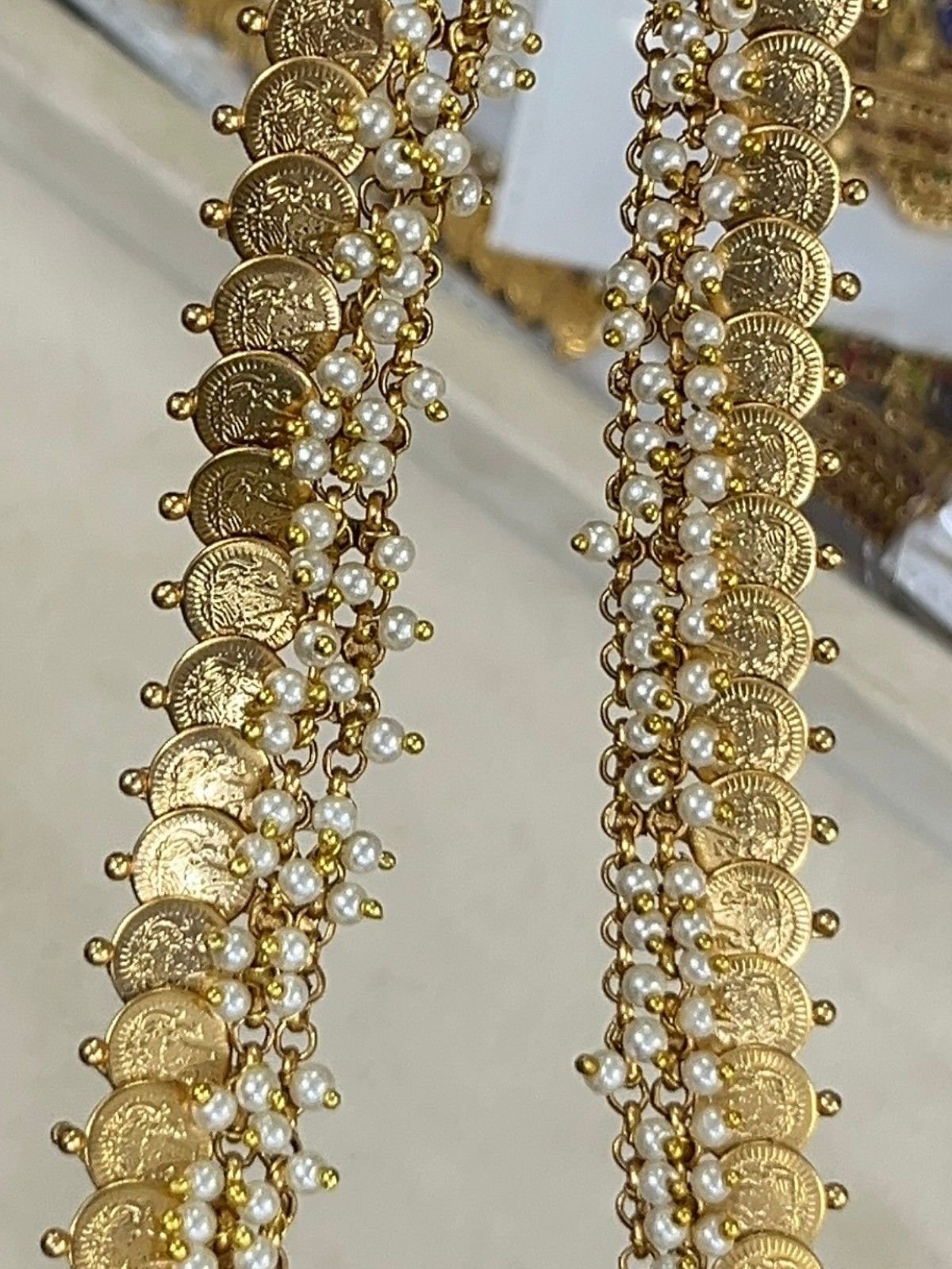 The long necklace features a dual-strand Kasu Mala (coin chain) strung with lustrous white pearl clusters on both sides, giving it a classic and regal South Indian bridal character.