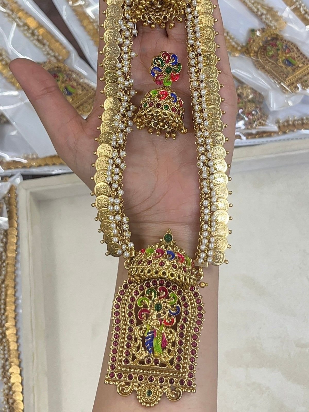 A divine bridal set featuring a long pearl coin chain with Lakshmi coin detailing, hand-crafted Radha Krishna pendant in rich meenakari enamel and kemp stones, paired with matching jhumka earrings. Perfect for weddings, festivals, and traditional occasions.