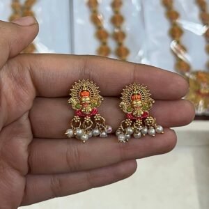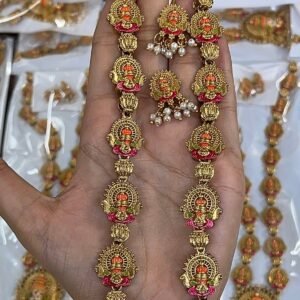 Celebrate divine devotion with this magnificent Yellamma Devi Temple Long Necklace & Earring Set, crafted in the finest South Indian temple jewellery tradition. Every element of this set is a tribute to the sacred goddess, making it as spiritually meaningful as it is visually stunning.