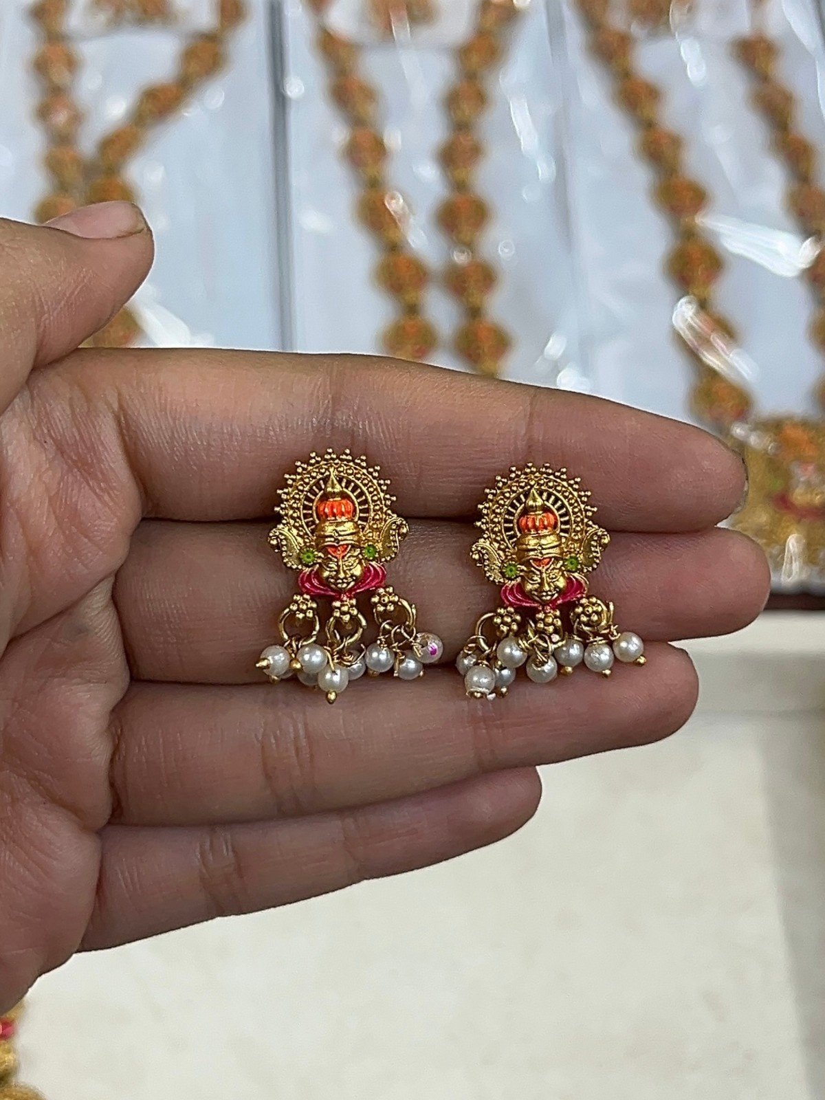 The matching Devi earrings mirror the necklace perfectly, featuring the same goddess face motif with enamel work, surrounded by a golden halo, and finished with charming pearl dangles at the bottom.