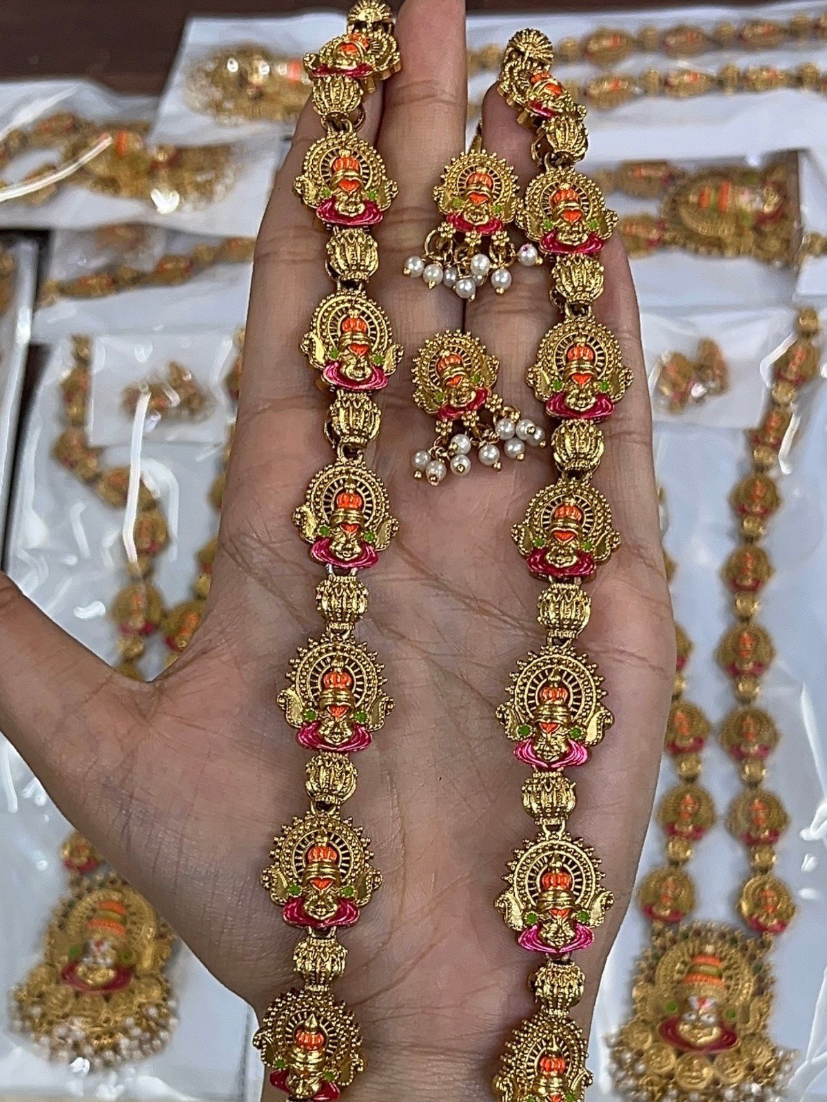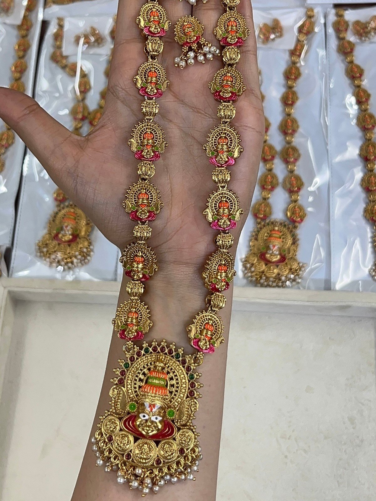 The long necklace is designed with repeated Yellamma Devi deity motifs throughout the entire chain, each piece intricately crafted in antique gold with vibrant enamel detailing in orange, pink, and green — connected by textured gold beads that add to its grand, layered appeal.