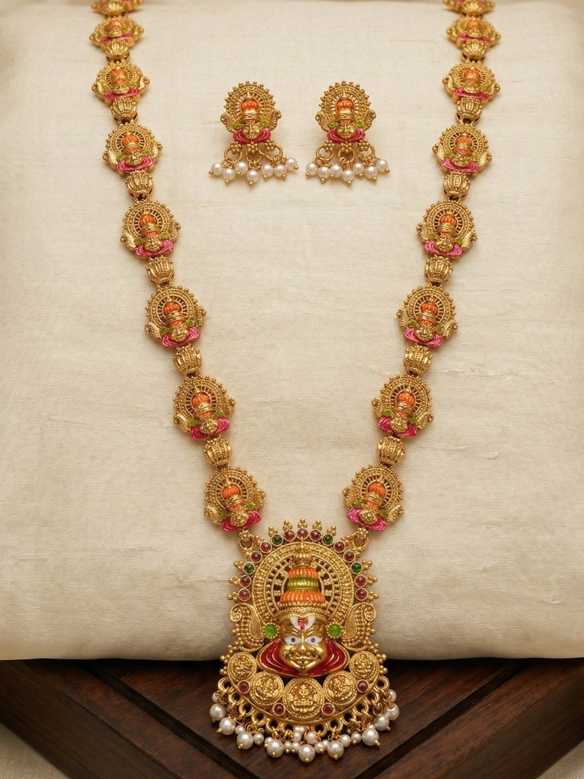 A sacred and striking temple jewellery set featuring repeating Yellamma Devi motifs along the entire chain, a large detailed Devi pendant with kemp stones and enamel work, and matching Devi earrings with pearl drops. Ideal for bridal, devotional, and festive occasions.